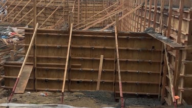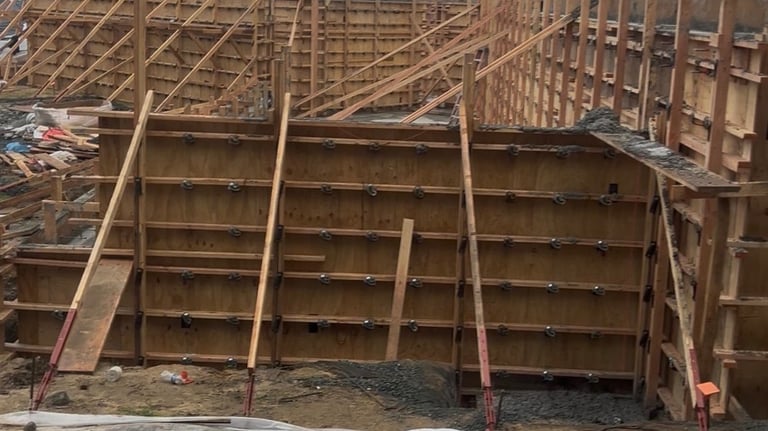 Wooden concrete formwork for a retaining wall foundation at a residential construction site.
